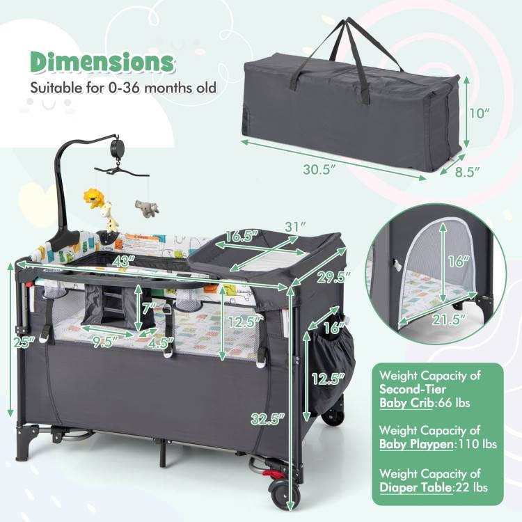 Grey Foldable Baby/Toddler Playpen Bassinet Bed Crib Music Box