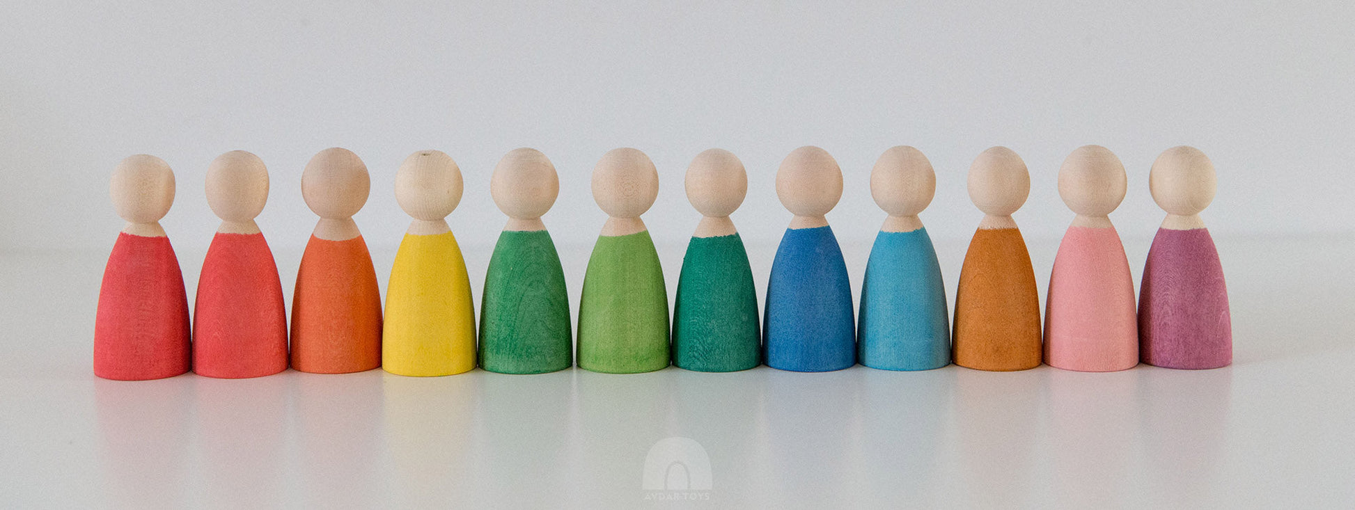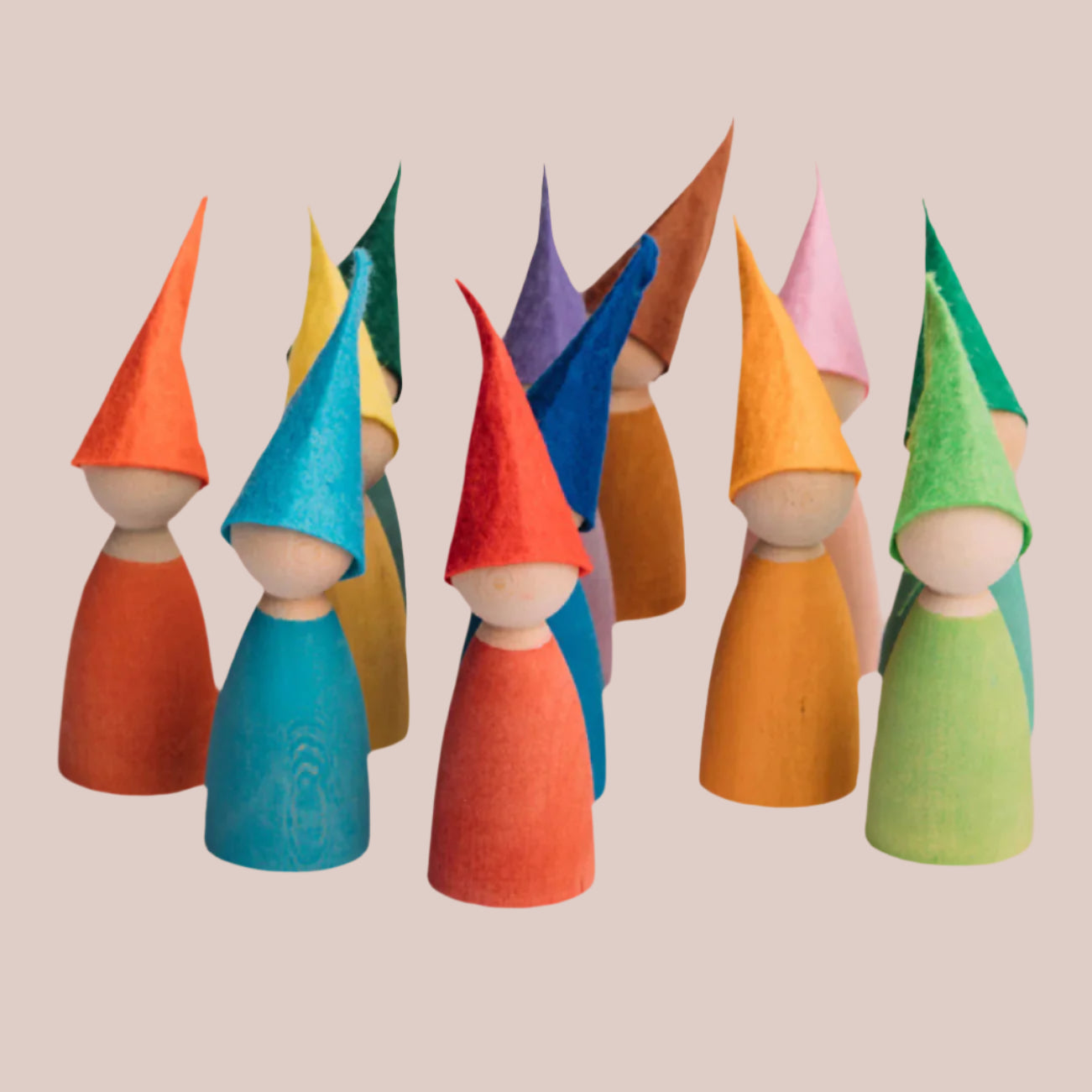 The Rainbow Friends set includes 12 handcrafted peg dolls made from solid lime wood and finished with non-toxic organic paint. Their smooth, grippy, and lightweight design makes them perfect for pretend play, while their cute hats add variety and extra play possibilities.